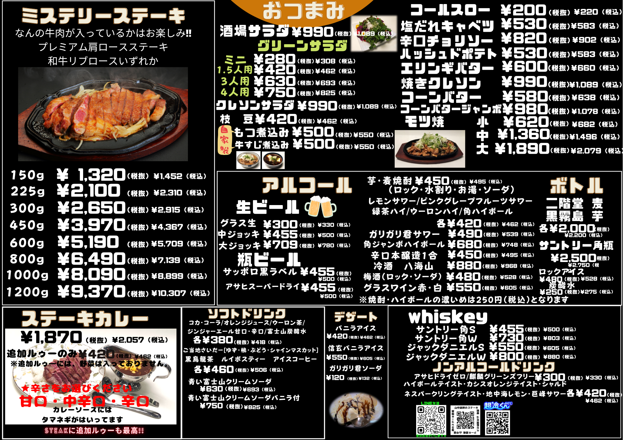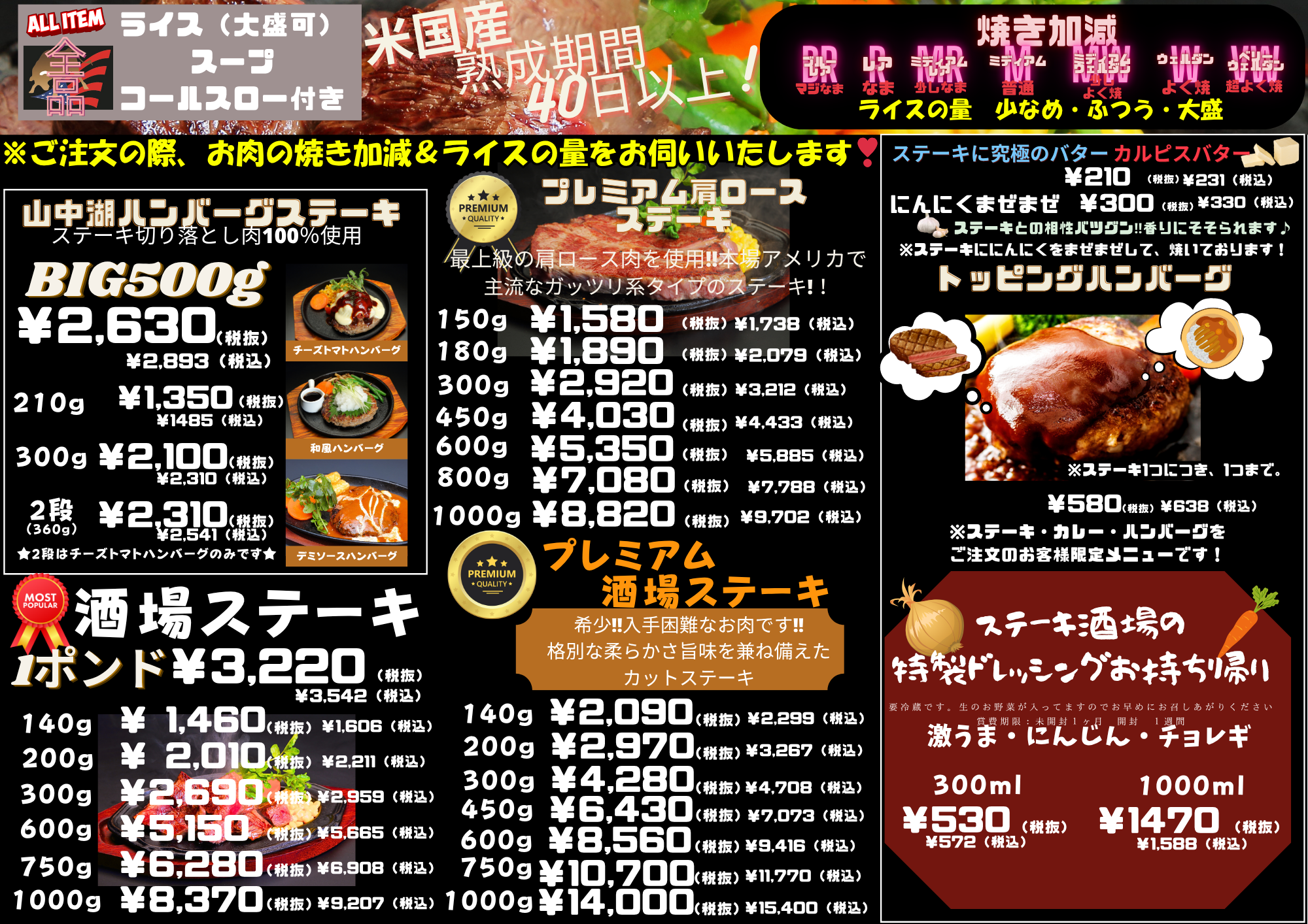 | メニュー | オリジナル酒場ステーキ リブロースステーキ 肩ロースステーキ ハンバーグ |