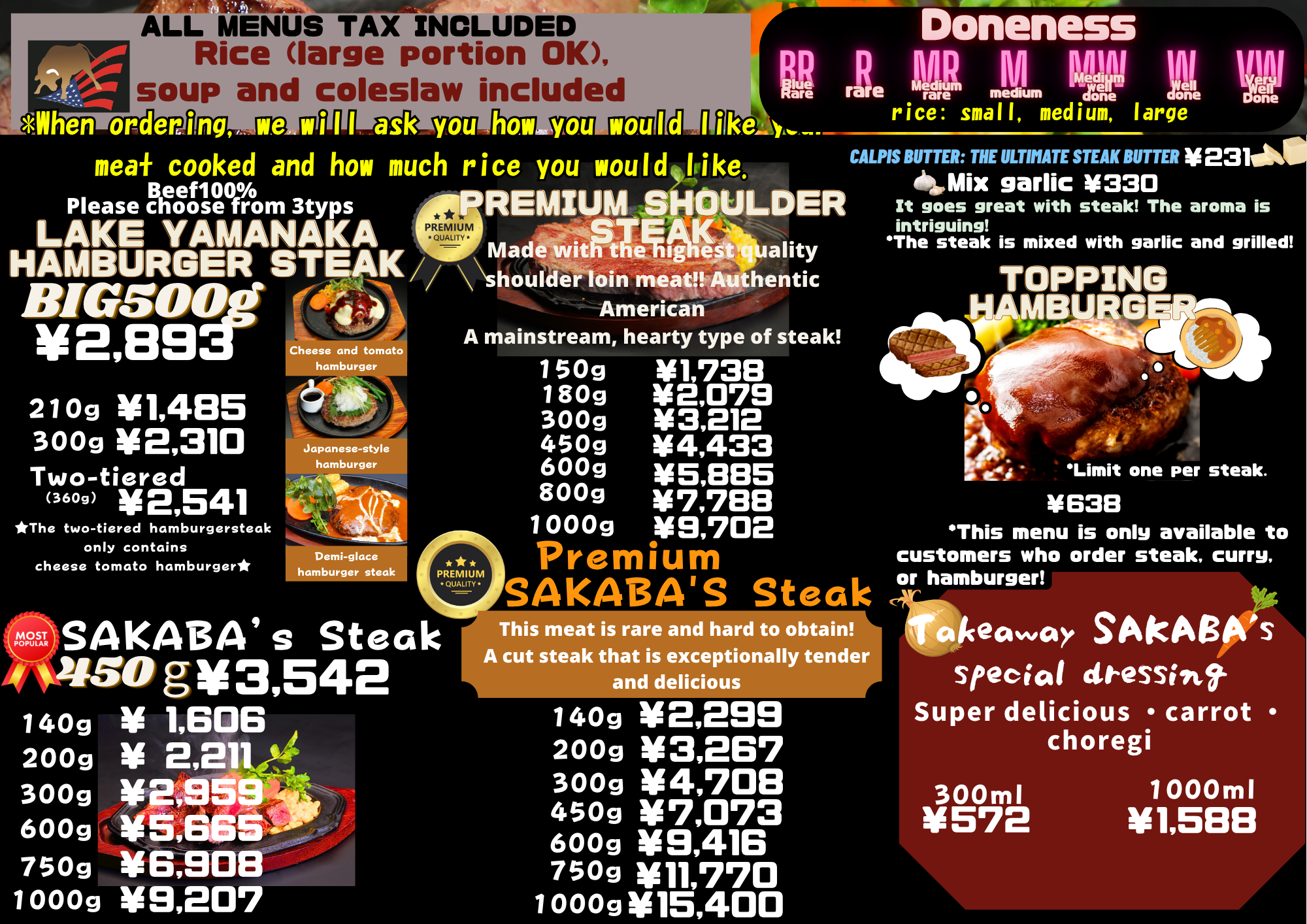 | アクセス | 車 河口湖IC~山中湖IC~国道138号~山中湖畔のステーキ酒場 |